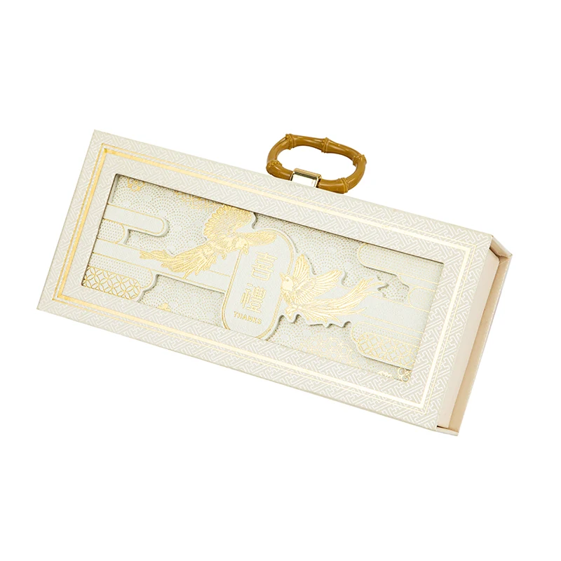 A doboz felületét aranybélyegzési technikák díszítik, dupla főnixekkel, felhőmintákkal és geometrikus mintákkal. A "喜礼" kalligráfiai szavak hozzáadásra kerülnek, tejfehér alapszínnel, amely meleg és csúcsminőségű. Kínai ünnepi hangulata van anélkül, hogy túlzottan hivalkodó lenne. Legyen szó esküvőről, születésnapi bankettről, vagy ajándékozásról a Közép-Őszi Fesztivál idején, elegáns keleti hangulatot közvetít. Vizuális felismerése messze felülmúlja a hagyományos, egyszínű díszdobozokat.